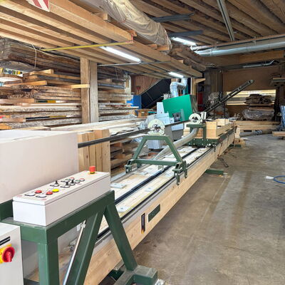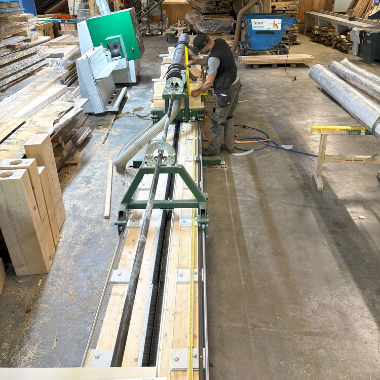 Dann begann die eigentliche Arbeit: zentrische Bohrungen in drei bis sechs Meter lange Massivholzstämme mit einem Durchmesser von circa 25 Zentimeter.