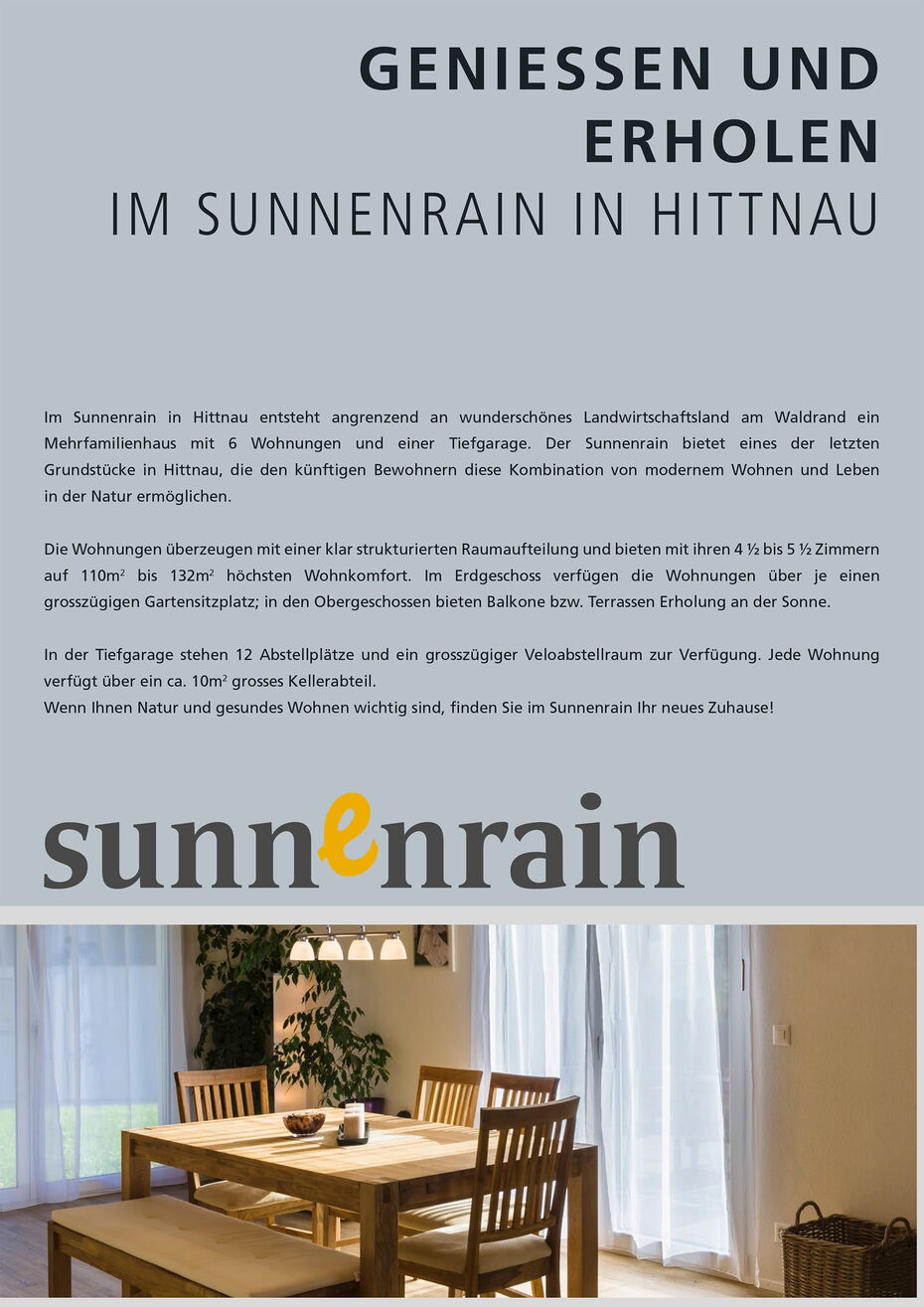 Beim Bau des Mehrfamilienhauses «Sunnenrain» werden die Prinzipien der Nachhaltigkeit und des schonenden Umgangs mit wertvollen Ressourcen konsequent umgesetzt.