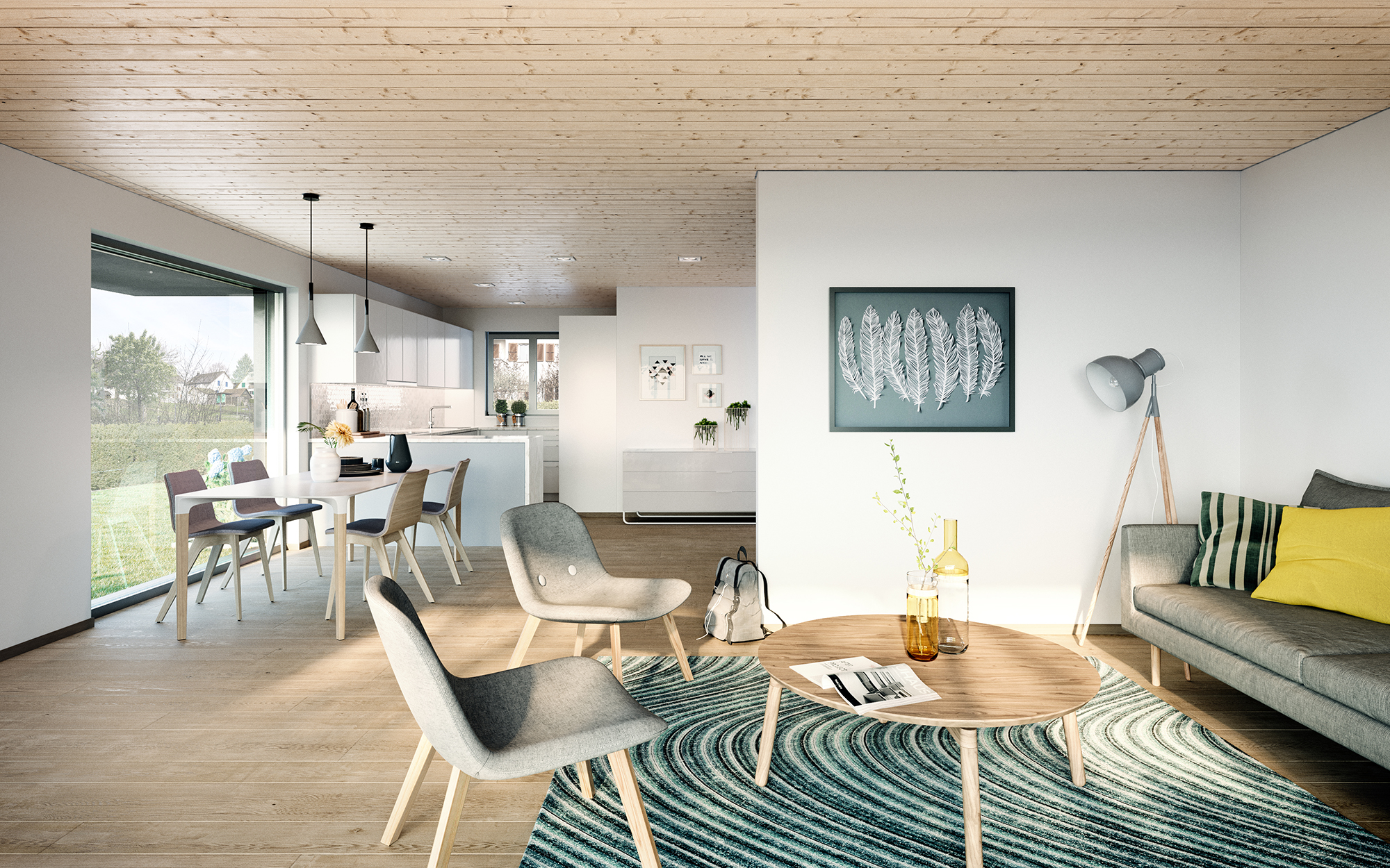 • einmalige Symbiose von Wohnen auf dem Land verbunden mit modernster Holzbauweise