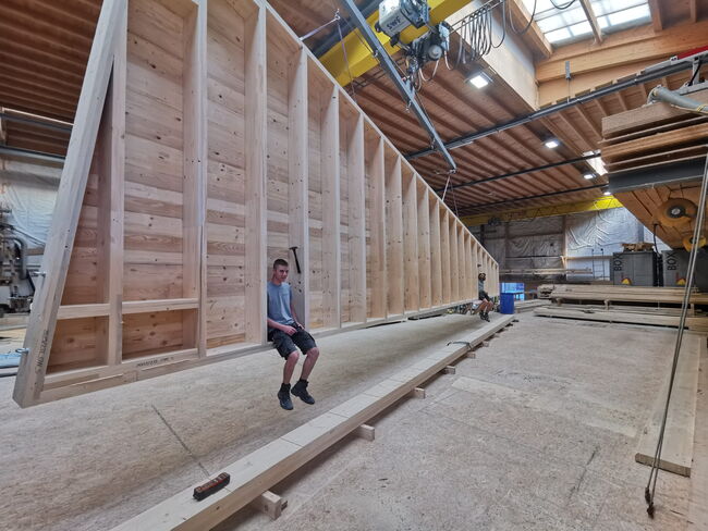 Sieht gemütlich aus! Erstes Gibelwandelement für unsere Produktionshalle in Saland.