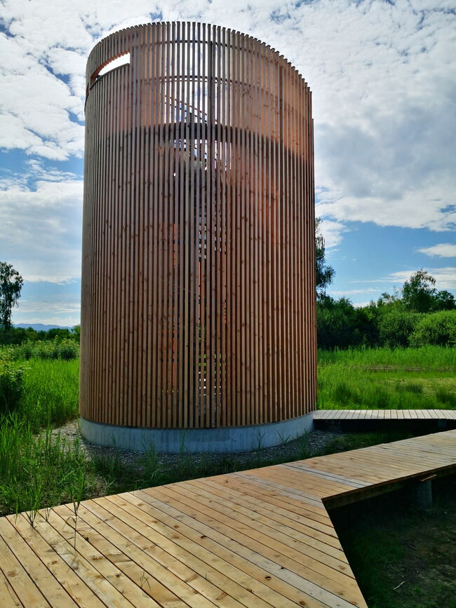 Nicht zu übersehen ist das Herzstück des neuen Erlebnispfades: der Aussichtsturm, Holzbau von Schindler & Scheibling. Ab 3. Oktober können Sie den Rundumblick von ganz oben geniessen – dann wird der Turm nämlich offiziell eröffnet.