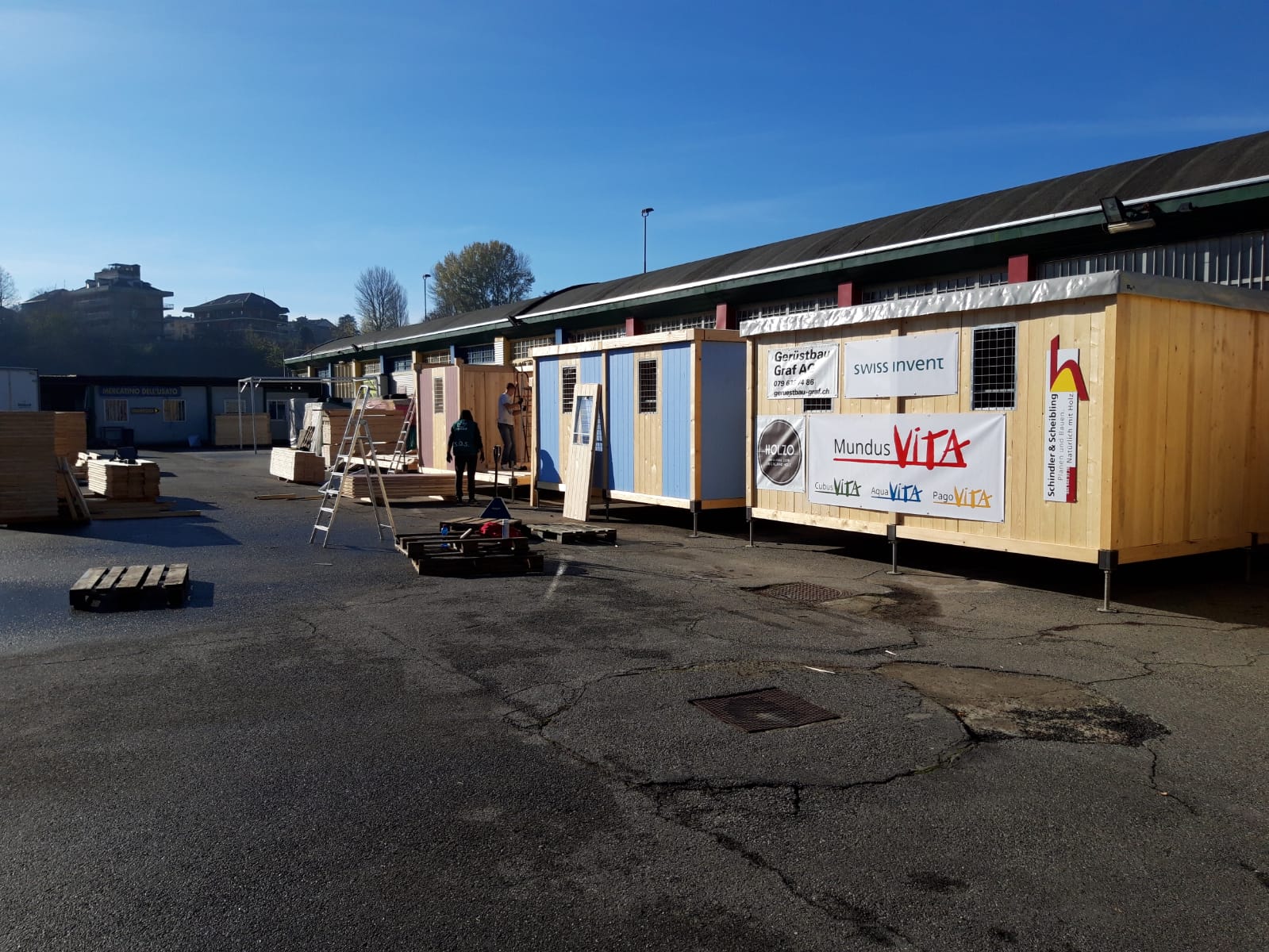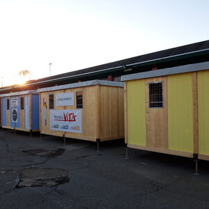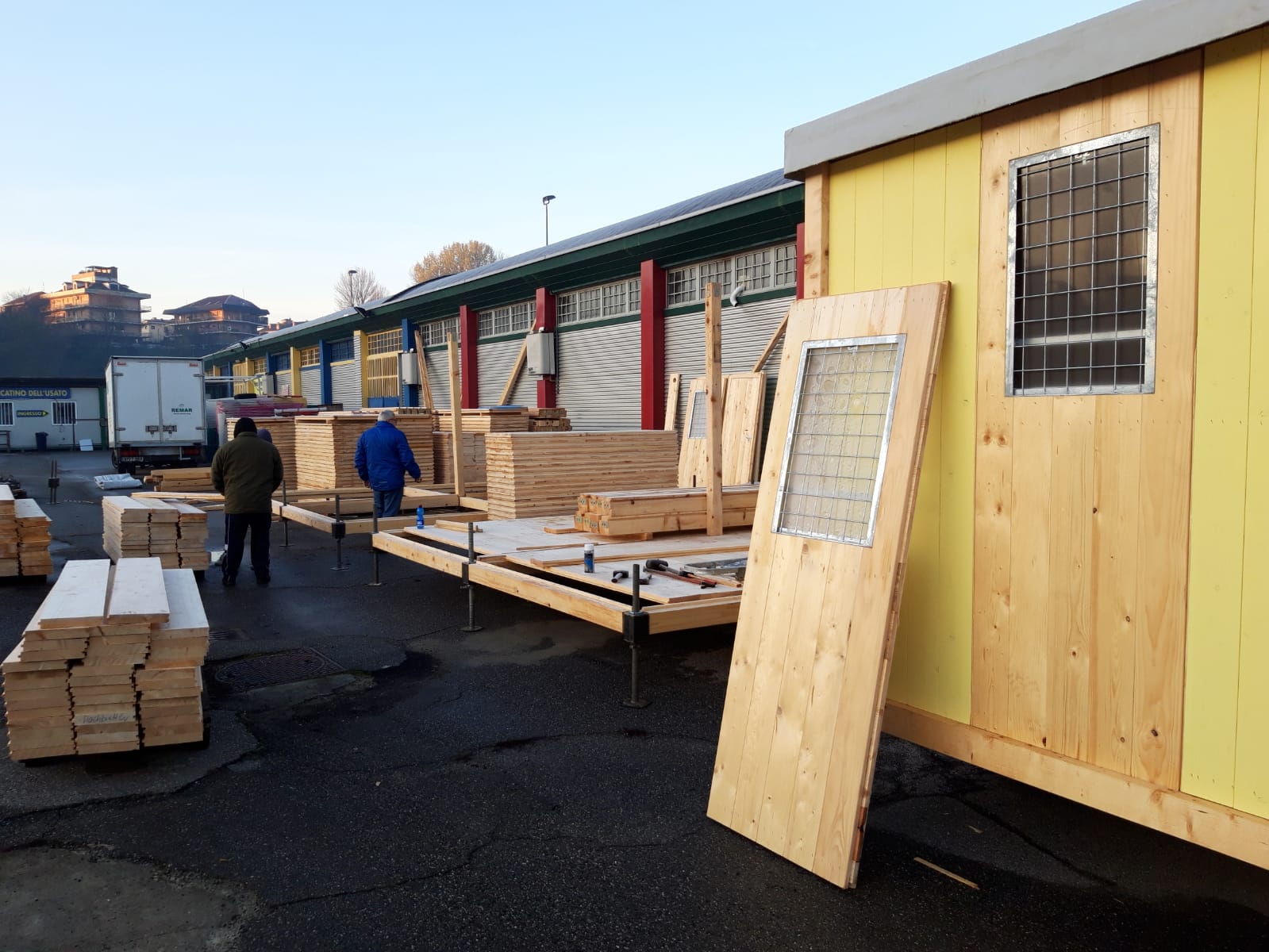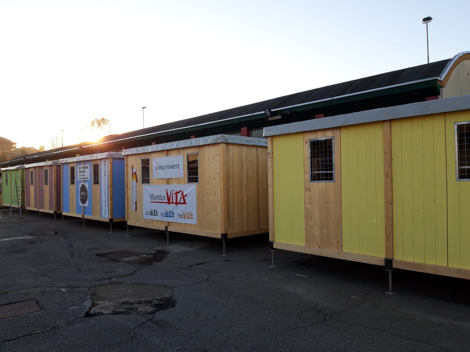 Nach bereits zwei Tagen stehen alle Unterkünfte fast fertig in Form eines Dorfs. Dies sind nun die ersten fertigen Cubus VITA, die Menschen in Not in Turin helfen sollen. Bald können die Unterkünfte bezogen werden.