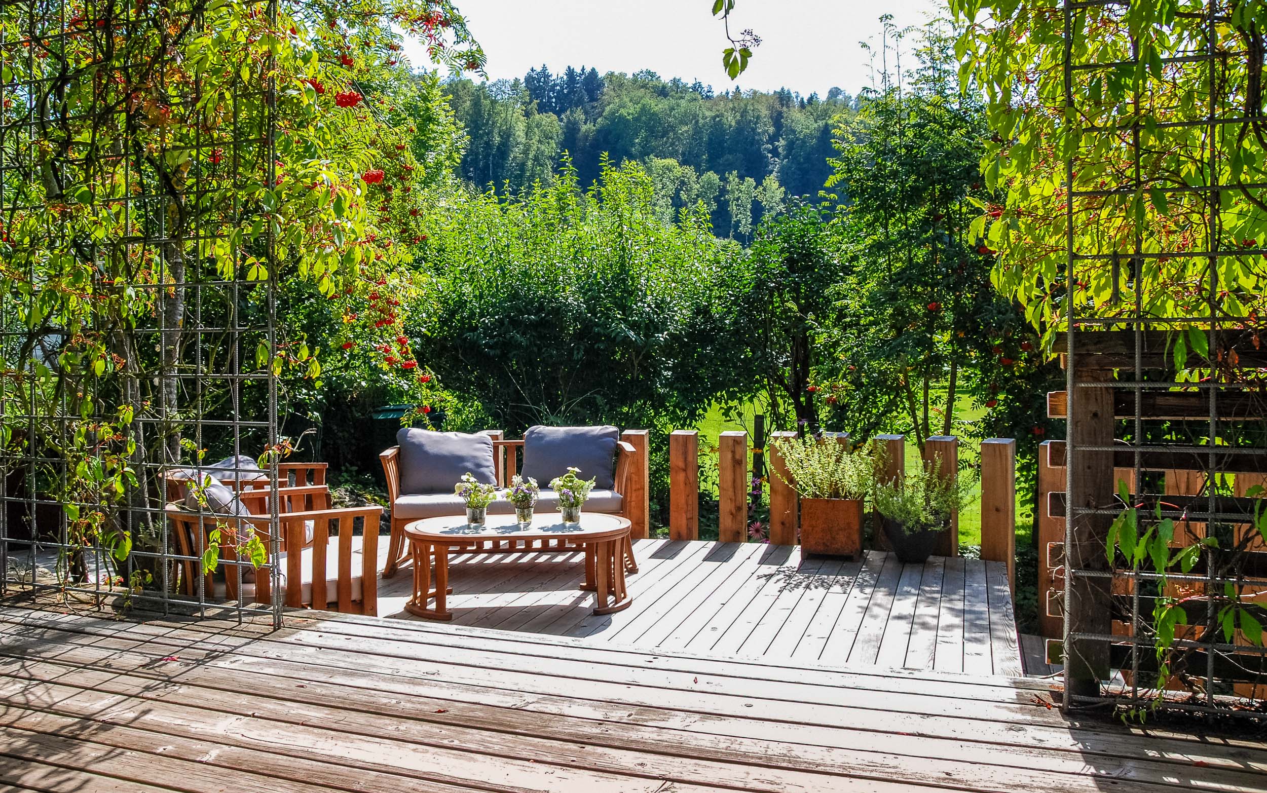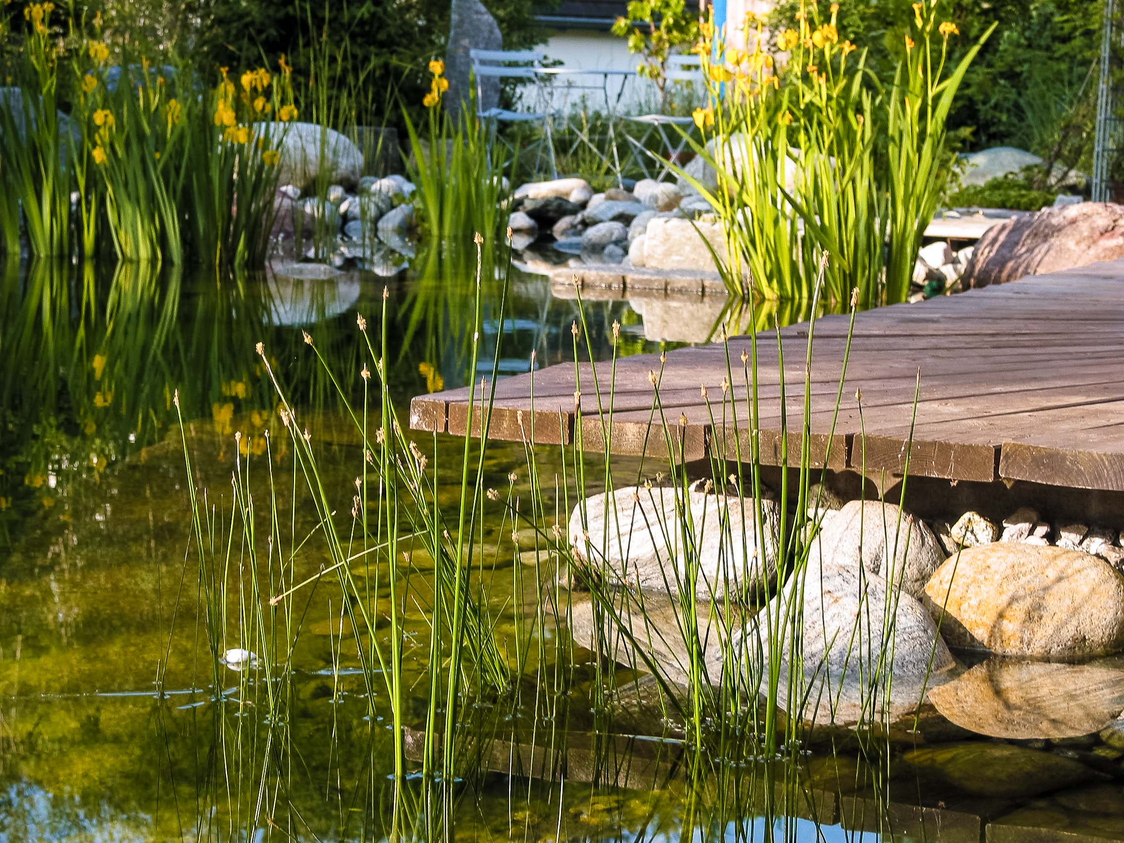Umgebungsgestaltung EFH in Bauma mit Naturteich, Aussendeck und Sichtschutzwänden