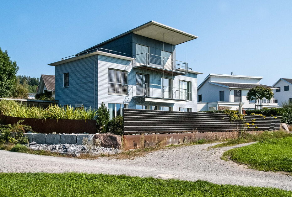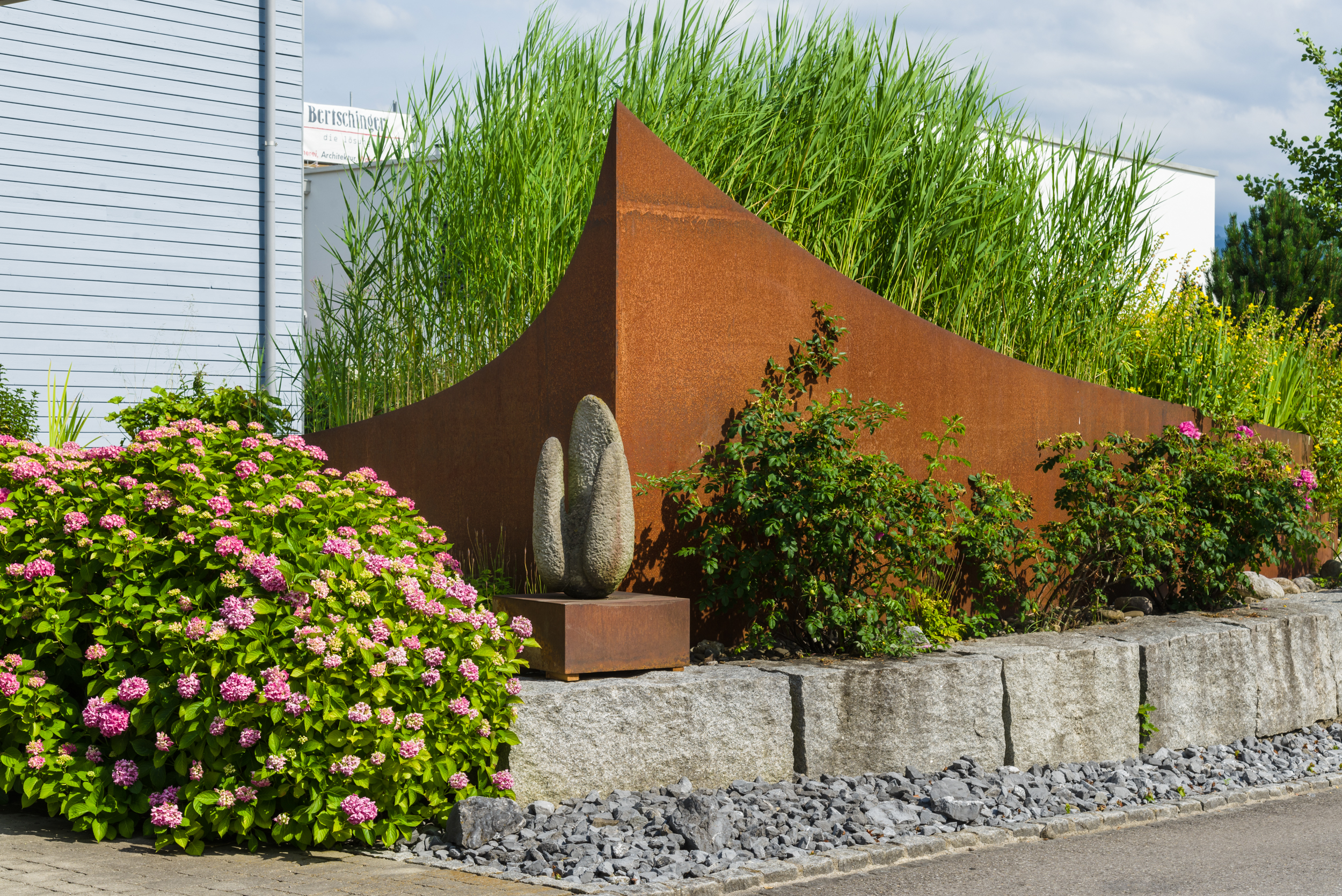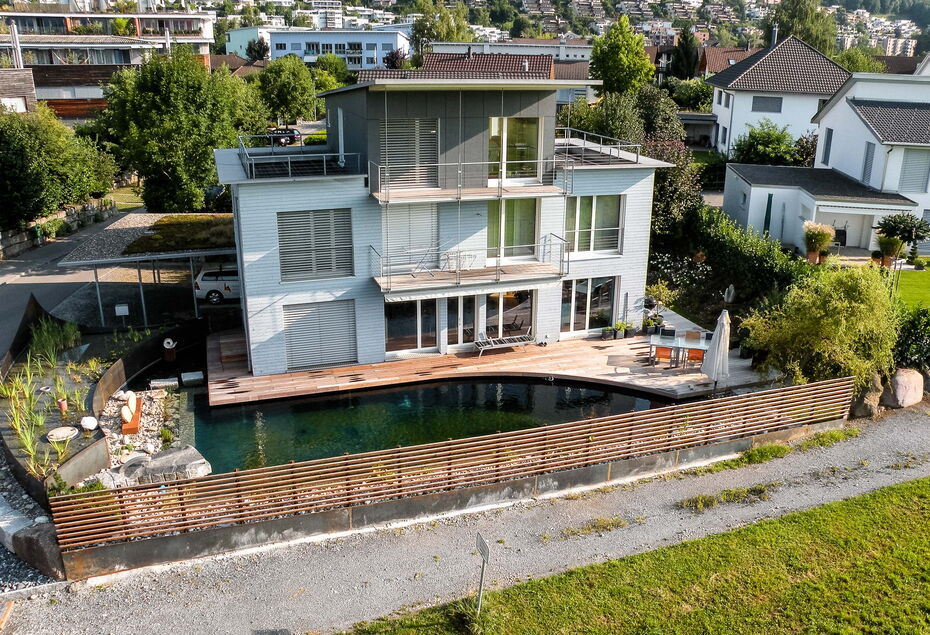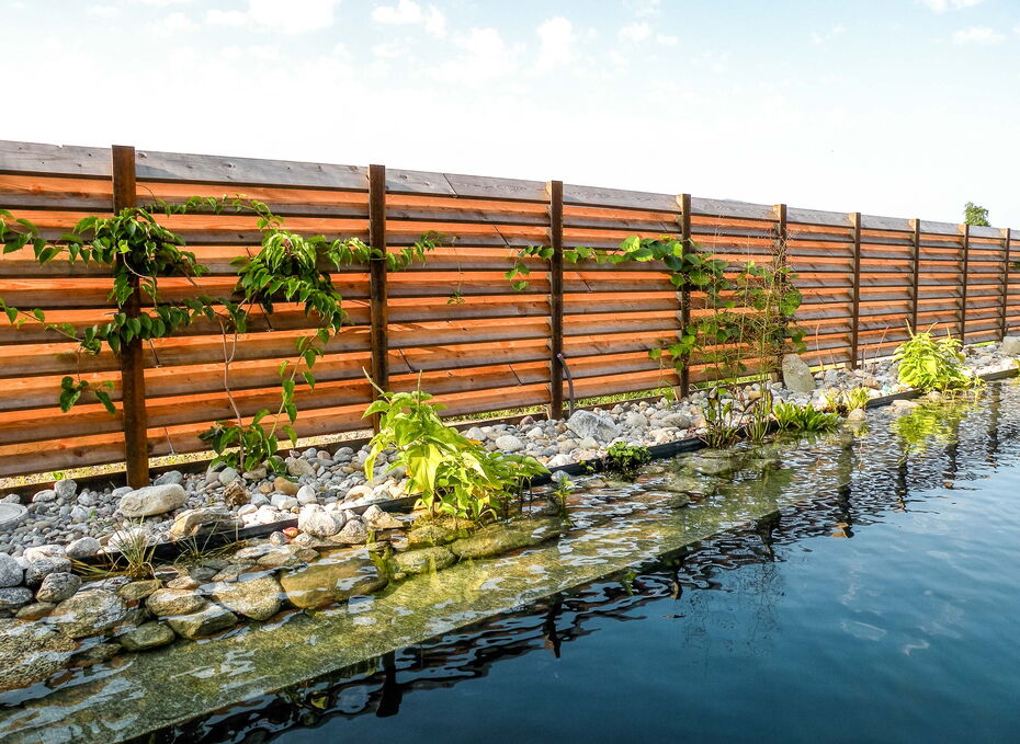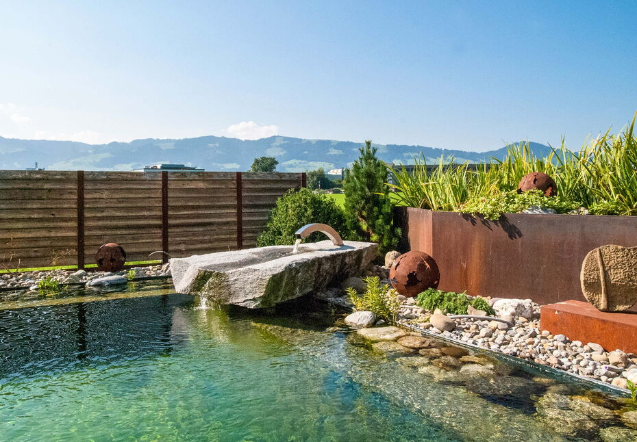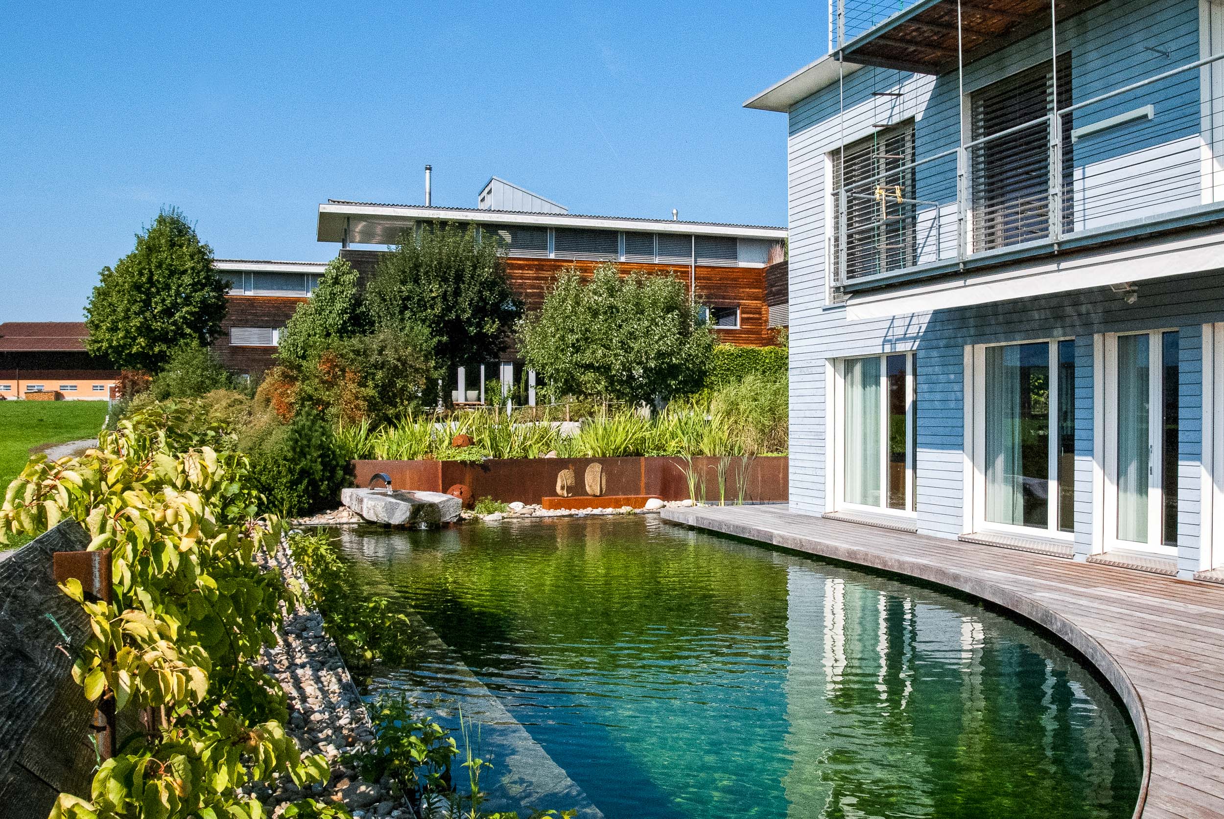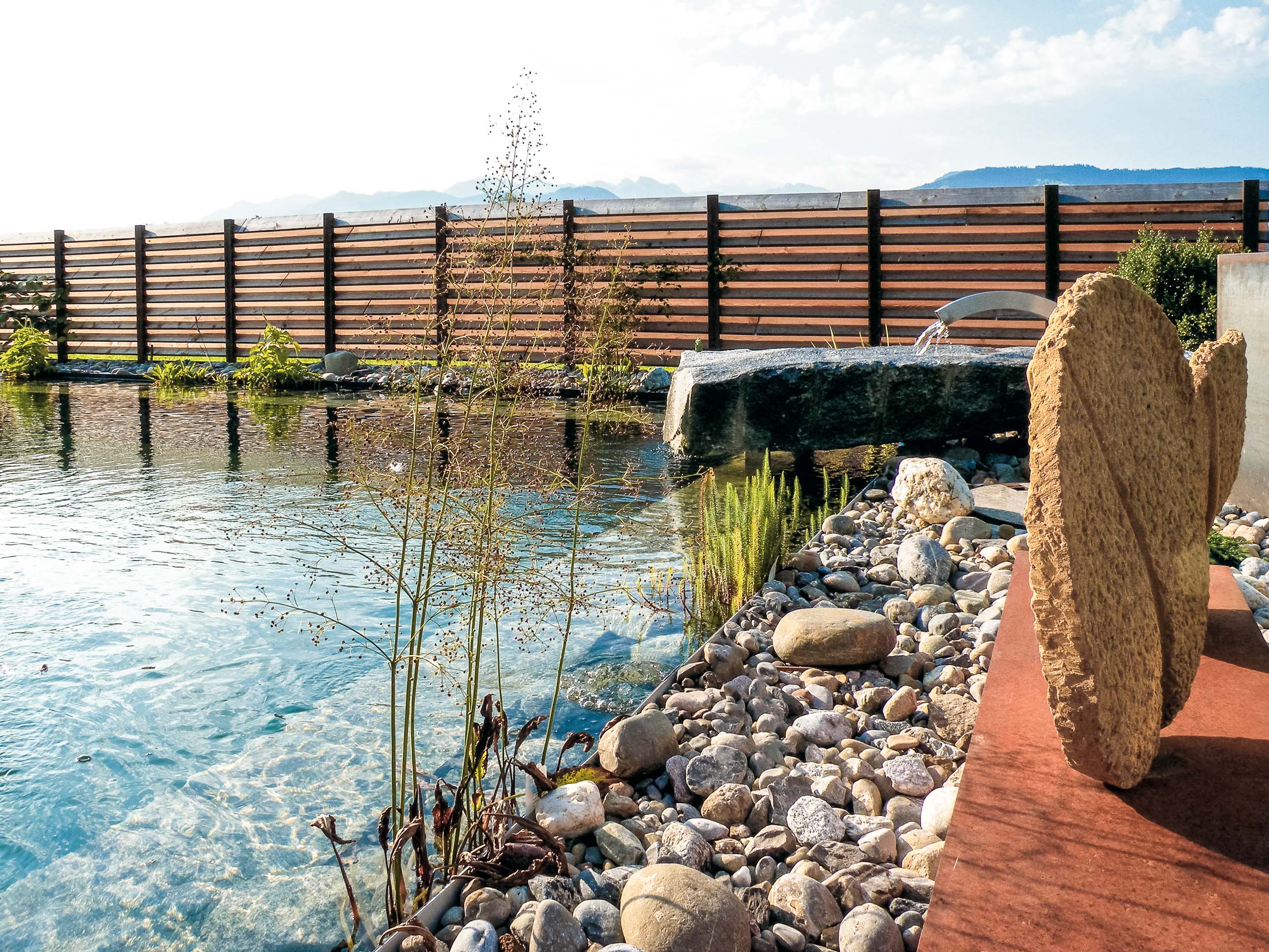 Umgebungsgestaltung EFH in Jona mit Sichtschutzwänden und Teichanlage