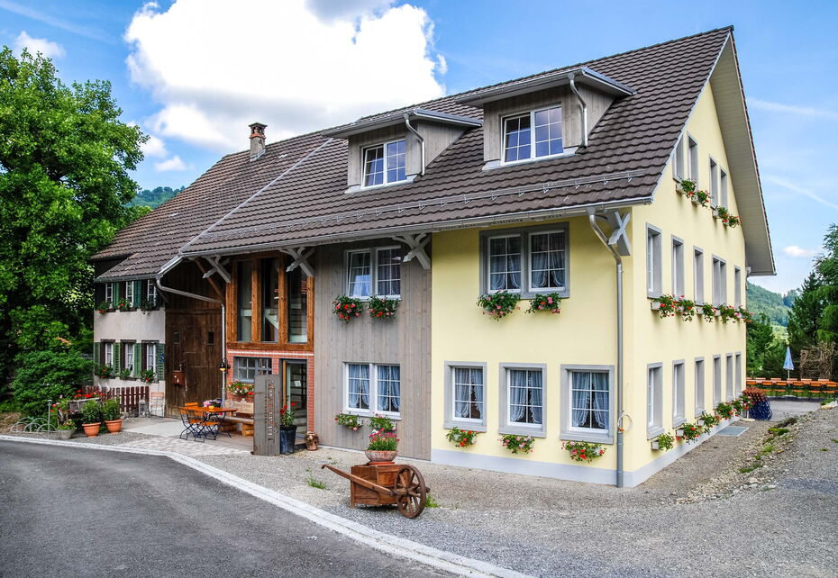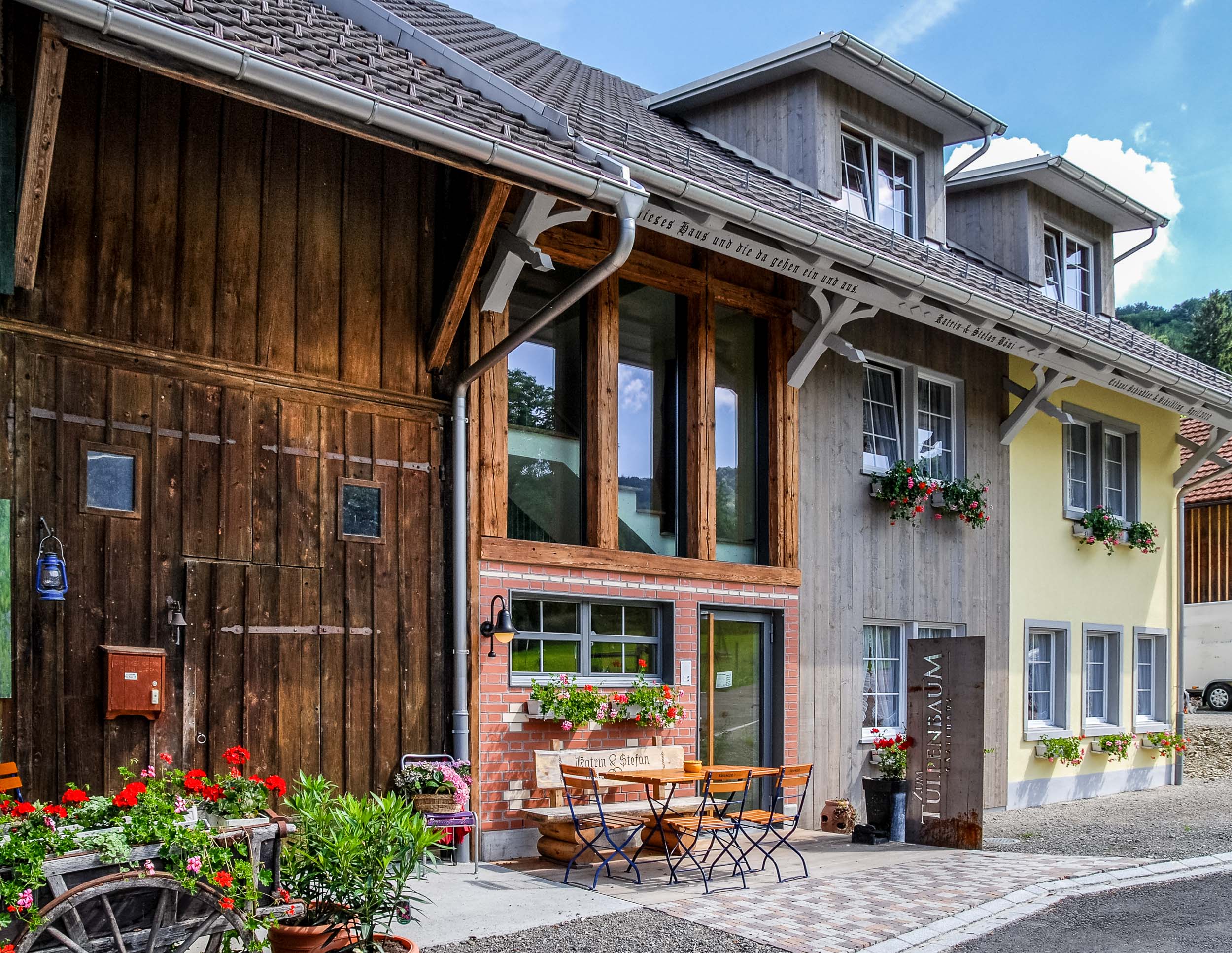 Umbau eines fünfteiligen, denkmalgeschützen Bauernhauses in ein Bed & Breakfast-Gästehaus mit Restaurant und Käsekeller in Neubrunn (Turbenthal)