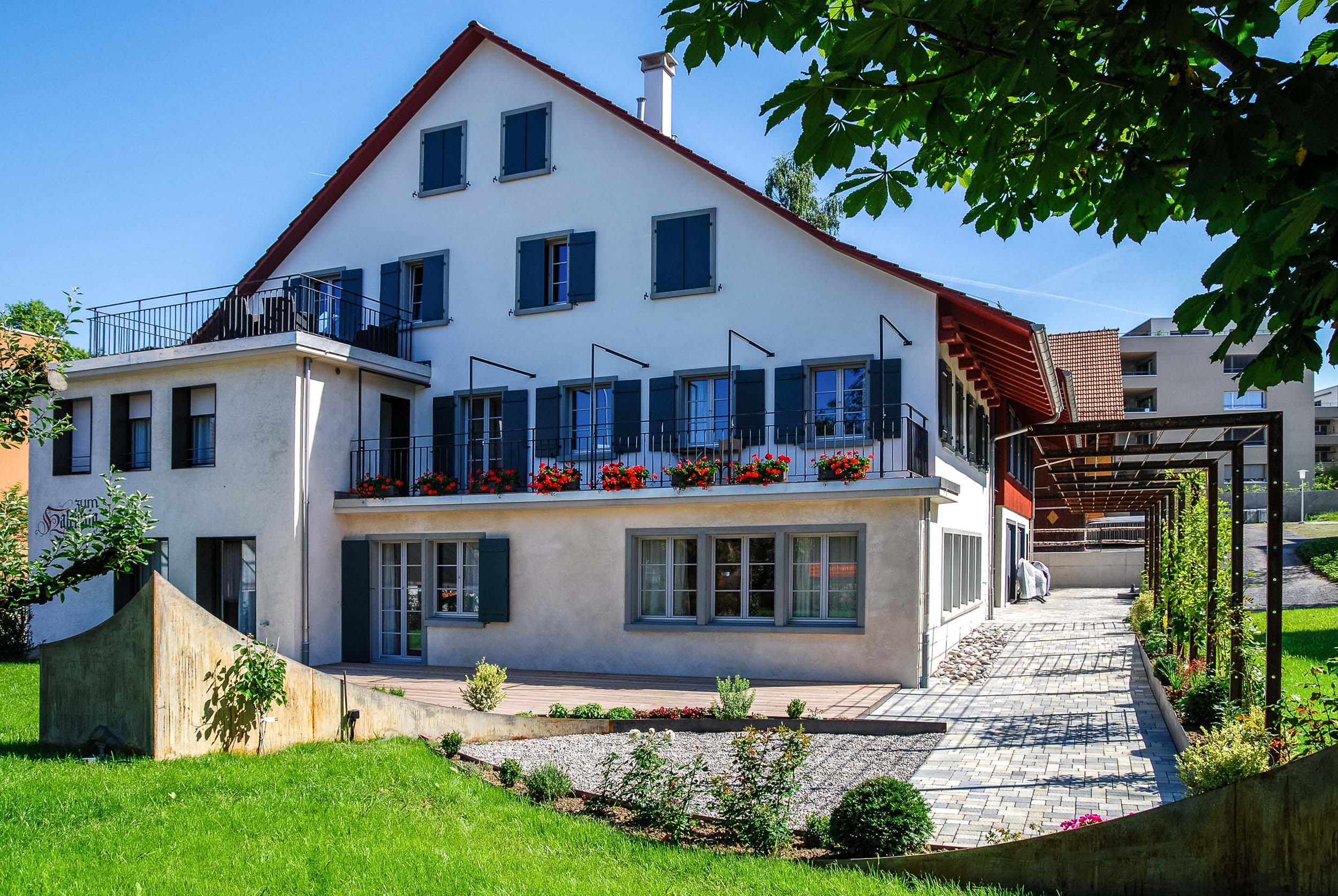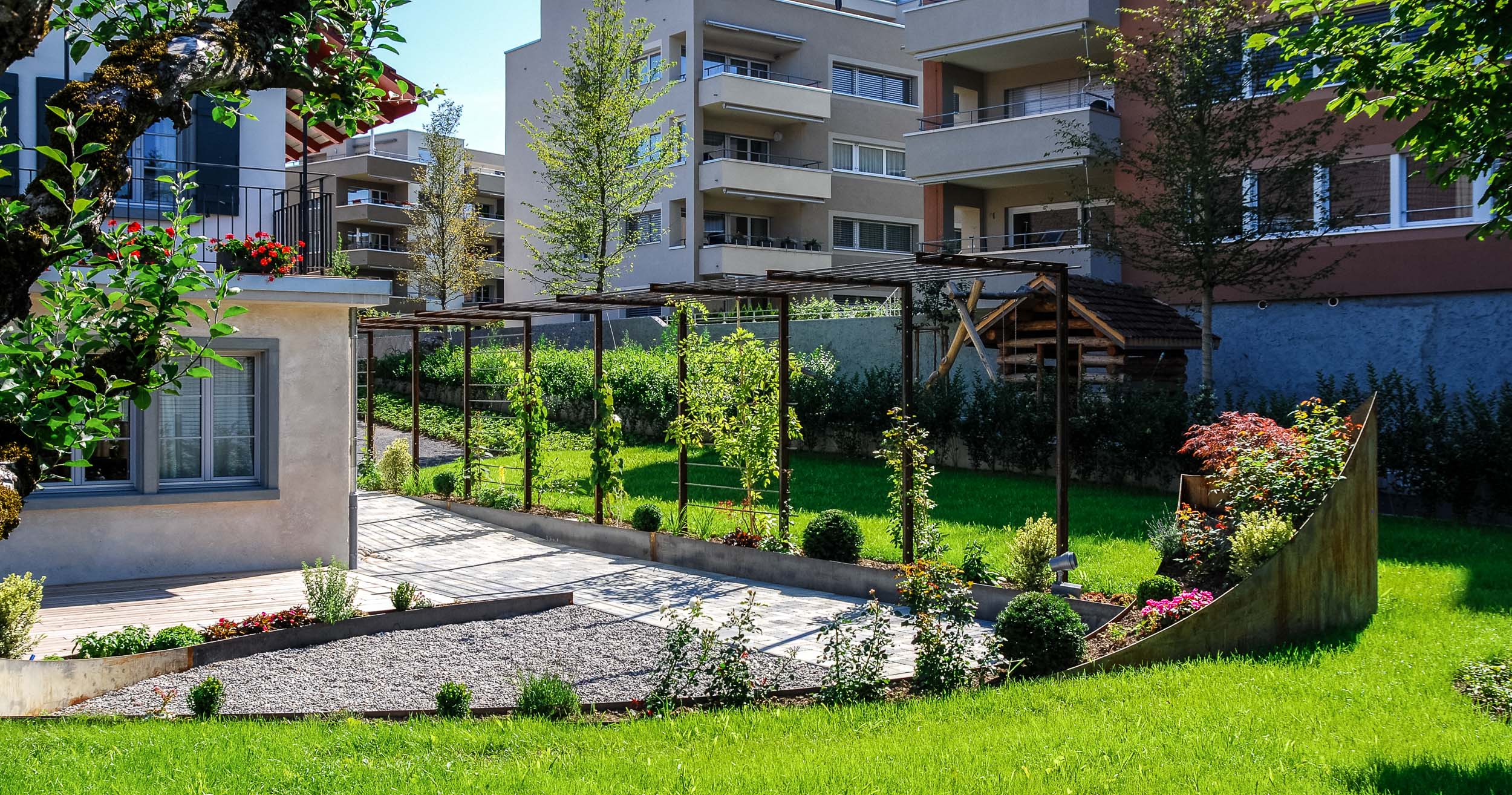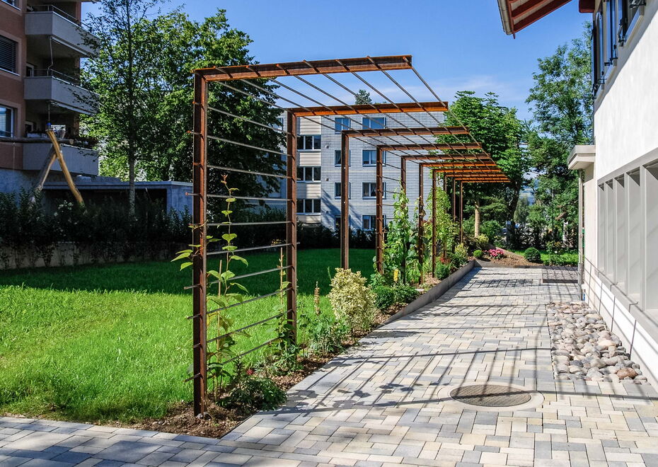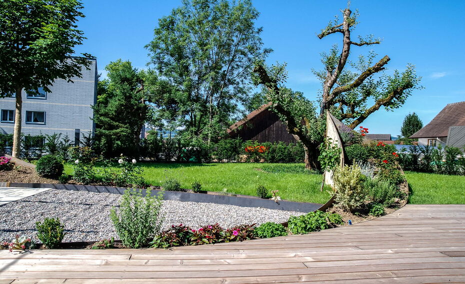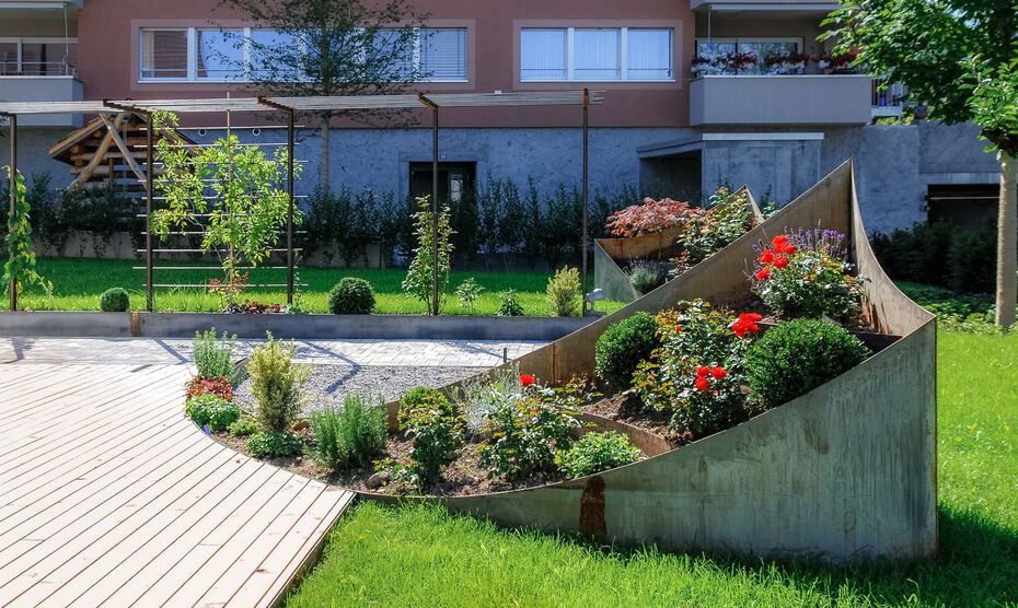 Umgebungsgestaltung Einfamilienhaus in Uster mit Hochbeeten, Aussendeck und Rankspalier aus Stahl